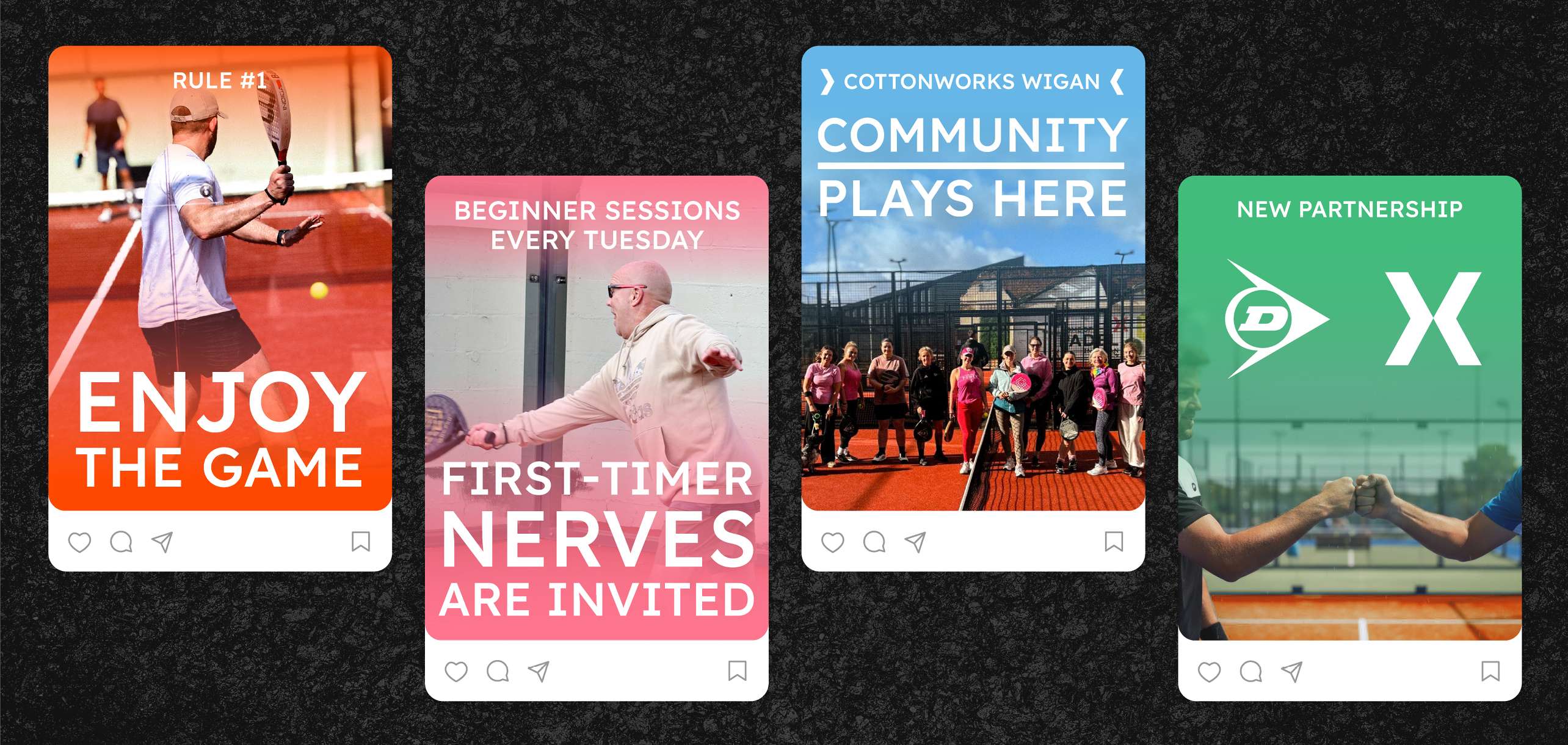 We suggested a name tweak to introduce an ‘X’ motif. We took their court surface as inspiration for their brand colour. We created the elements to show how the experience is super-welcoming and unintimidating.